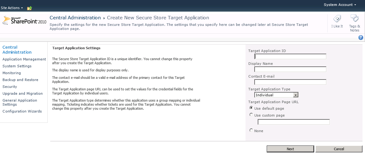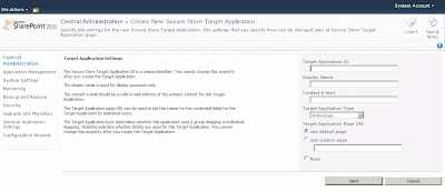 Now add the name of your target app id, for instance “Visio” or maybe the name of your external data source, add a Display name, contact email, target application type (which decides HOW your users should authenticate – as them selves or as a group, I selected “individual”) and then just click “Next”: