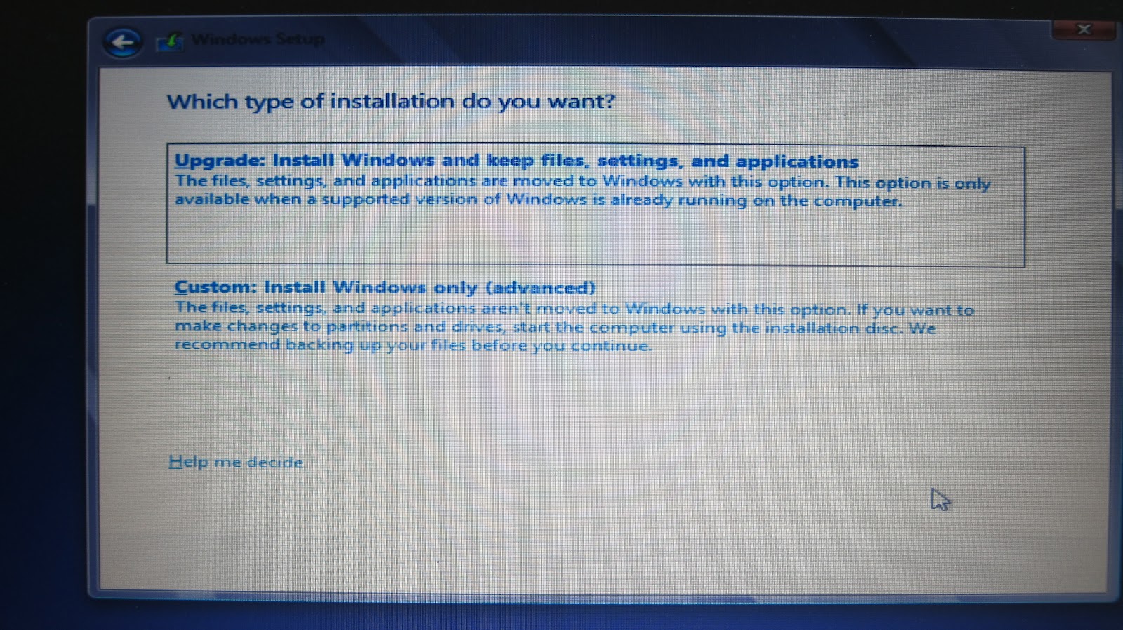 Since I ran a Home Edition of Windows 7, I was not able to select “Upgrade” since I am installing an Enterprise version. So it had to be “Custom: Install Windows only (advanced)” which means a complete reinstallation. You have to select what partition to install it on.