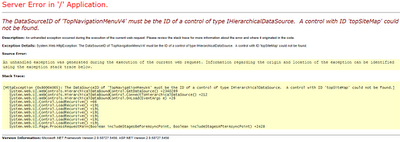 “The DataSourceID of ‘TopNavigationMenuV4’ must be of the ID of a control of type IHierarchicalDataSource. A control with ID ‘topSiteMap’ could not be found.”
